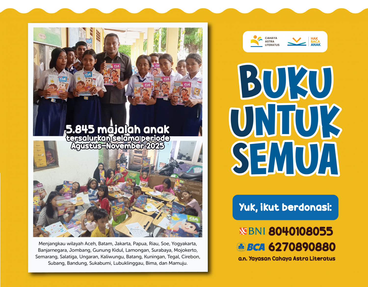 Ayo ikut berdonasi via @cahayaastraliteratus BNI 8040108055 atau BCA 6270890880 a.n. Yayasan Cahaya Astra Literatus dan jadi jembatan mimpi 🌜. Rp500.000 sudah berbagi paket 30 eksemplar Majalah CIA/ISO untuk anak-anak yang paling membutuhkan.